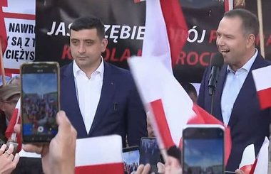 Nawrocki pokazuje się na wiecu wyborczym z pro-ruskim, skrajnie prawicowym kandydatem na Prezydenta Rumunii George Simionem,