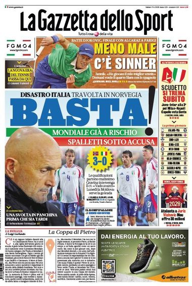 „Basta!”. După eşecul naţionalei Italiei cu Norvegia, în primul meci de calificare la Cupa Mondială 2026, La Gazzetta dello Sport, cel mai important cotidian sportiv italian vorbeşte despre un „dezastru” şi se teme că turneul din America de Nord este „în pericol”.