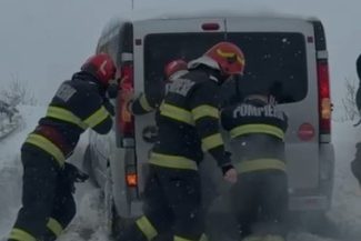 Ilfov: Intervenţie dificilă a pompierilor în Chiajna, unde un microbuz a rămas blocat din cauza zăpezii. Salvatorii au încercat să împingă autovehiculul, după care au eliberat drumul cu lopeţile – VIDEO