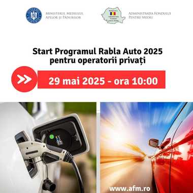 Administraţia Fondului pentru Mediu (AFM) anunţă că în 29 mai va începe Programul Rabla Auto 2025 pentru operatorii privaţi, în cadrul sesiunii fiind disponibile sumele de 60 de milioane de lei pentru achiziţionarea autovehiculelor noi cu sisteme de propulsie termică şi 610 milioane de lei pentru achiziţionarea autovehiculelor noi electrice sau plug-in hibrid.