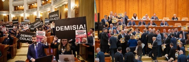 Şi parlamentarii USR au afişat mesaje în care cereau demisia premierului Ciolacu.
