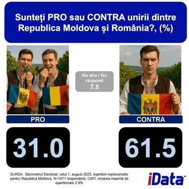 Împotriva unirii cu România se pronunţă 61,5% dintre cei chestionaţi, în timp ce 31% sunt favorabili unirii.