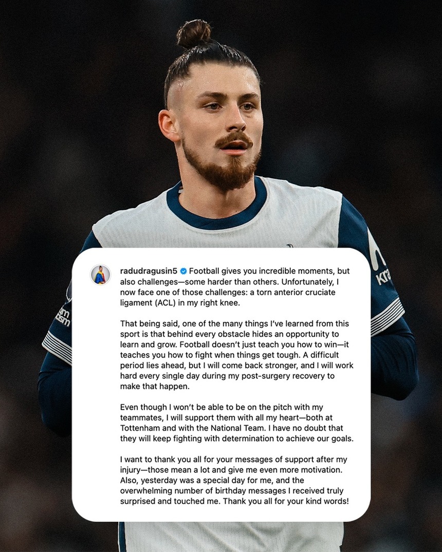 Putem confirma că Radu Drăguşin va fi operat pentru o leziune de ligament încrucişat anterior (ACL) la genunchiul drept.Radu va fi evaluat de echipa noastră medicală pentru a stabili când poate reveni la antrenamente Suntem cu toţii alături de tine, Radu, a anunţat clubul Tottenham.
