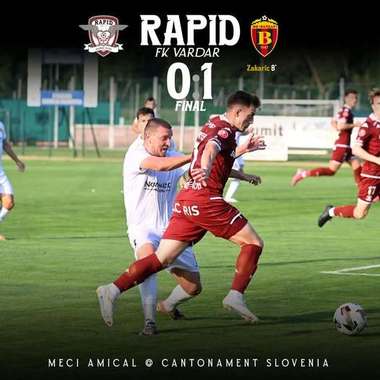 Formaţia Rapid a fost învinsă, marţi, scor 1-0, de echipa Vardar Skopje, în al doilea meci amical din cadrul stagiului de pregătire din Slovenia.