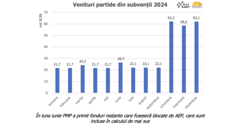 ”Autoritatea Electorală Permanentă a transferat în 2024 către partidele politice 386 de milioane de lei, din care 62 de milioane în luna decembrie. Totalul include şi fonduri primite de PMP ca urmare a unei decizii a instanţei. Partidul a primit peste 4 milioane de lei în luna iunie, fonduri care fuseseră blocate prin hotărâre a preşedintelui AEP încă din 2023 ca urmare a unei dispute legate de preşedinţia PMP, arată Expert Forum.