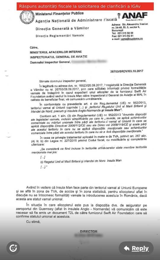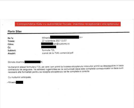 Acesta publică o srtrie de documente care arată că a purtat comunicări oficiale cu Direcţia Generală a Vămilor şi ANAF, atât anterior, cât şi ulterior preluării elicopterului de către IGAv.