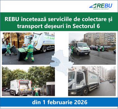 „Începând cu 1 februarie 2026, activităţile de colectare şi transport deşeuri desfăşurate de REBU SA în Sectorul 6 vor fi sistate. Toate contractele de prestări servicii încheiate între REBU şi utilizatorii din sectorul 6 produc efecte până la data de 31 ianuarie inclusiv, acestea încetând cu 1 februarie 2026. Pentru detalii privind noul operator de salubritate sau modalitatea de asigurare a continuităţii serviciului se recomandă contactarea Administraţiei Serviciului Public de Salubrizare Sector 6, instituţie care se află în subordinea Sectorului 6 al Municipiului Bucureşti”, se arată în comunicatul REBU.