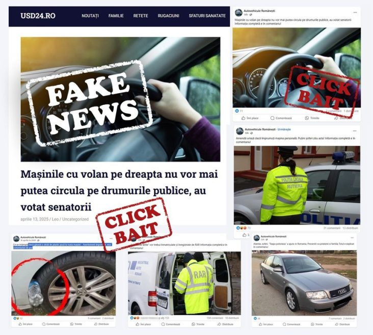 „Atenţie la dezinformare, clickbait şi fake-news! Interesul nostru pentru maşini, modificarea legislaţiei din domeniu şi teama că am putea fi luaţi prin surprindere de noutăţi pe care nu le-am aflat sunt aspecte care nu le puteau scăpa celor care ne exploatează în scopuri negative atenţia şi timpul pe reţelele sociale. (…). În ultima perioadă, ne-au atras atenţia diferite postări şi materiale menite să genereze panică, neîncredere sau chiar revoltă printre deţinătorii de vehicule. Cititorii sunt bombardaţi cu tot felul de informaţii false, extrase din context sau cu ştiri «reşapate» cu rolul de a aduce accesări paginilor şi site-urilor respective”, precizează specialiştii Registrului Auto Român.