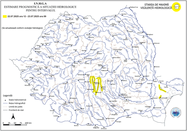 Institutul Naţional de Hidrologie şi Gospodărire a Apelor a emis o atenţionare hidrologică Cod galben valabilă de marţi, de la ora 12:00, până miercuri, la ora 09:00.