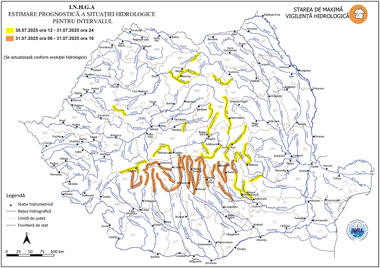 Institutul Naţional de Hidrologie şi Gospodărire a Apelor a emis o actualizare a codurilor hidrologice, în contextul prognozei meteorologice şi a situaţiei hidrologice actuale, vizând fenomene precum scurgeri importante pe versanţi, torenţi şi pâraie, viituri rapide pe râurile mici, creşteri de debite şi posibile depăşiri ale cotelor de apărare.