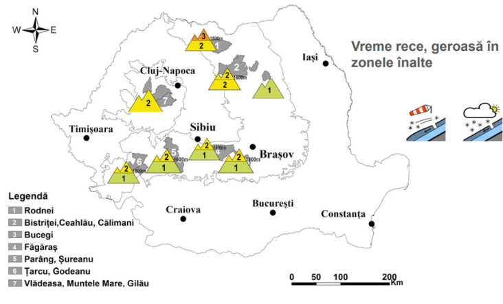 În întreaga zonă montană, vremea va fi rece, geroasă la peste 2000 m, dar temporar şi la altitudini mai joase în cursul nopţilor şi dimineţilor.