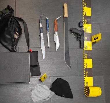 Poliţiştii au găsit abandonate, şi în toaleta dintre etajele clădirii, o borsetă în care era un briceag cu lama de 15 centimetri şi o geantă cu un pistol tip airsoft şi o macetă cu lama de 60 de centimetri.