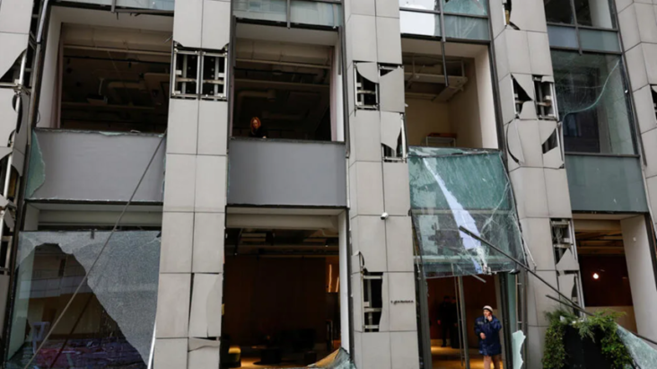 Autorităţile au publicat imagini în care apar acoperişul unui imobil de birouri de lux parţial distrus şi carcase arse de maşini.