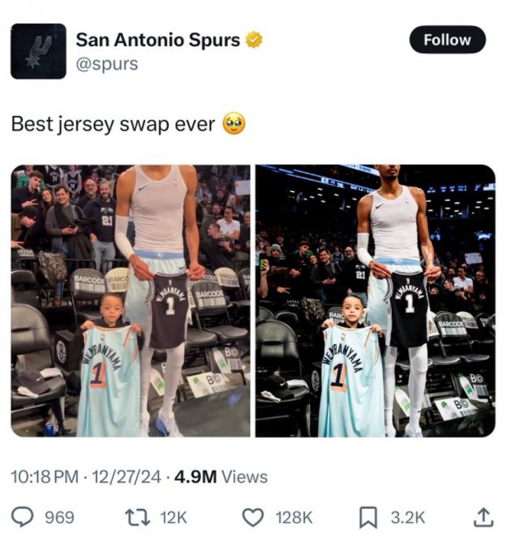 Vânzarea pe internet a tricoului lui Victor Wembanyama, dăruit de starul Spurs unui băieţel de 5 ani la finalul unui meci din San Antonio, l-a emoţionat şi şocat pe starul francez. Tatăl copilului s-a răzgândit şi a cerut ordin de restricţie temporară la Curtea Supremă din New York, dorint ca vânzarea să fie anulată a dezvăluit site-ul CLCT.