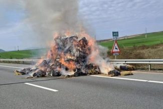 Trafic rutier blocat temporar pe A10 pe sensul Cluj-Alba, din cauza unui incendiu izbucnit la un autocamion care transporta baloţi de lucernă – FOTO