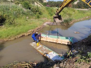 Pentru implementarea acestor soluţii, s-au folosit materiale adaptate specificului local cherestea pentru structura de susţinere, folie de polietilenă pentru etanşare şi saci cu nisip pentru dirijarea debitelor şi piatră spartă (100–300 mm) pentru stabilizarea albiei.