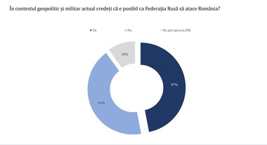 La întrebarea ”În contextul geopolitic şi militar actual credeţi că e posibil ca Federaţia Rusă să atace România?”, 47% dintre subiecţi au răspuns afirmativ, în timp ce 43% nu consideră posibil acest lucru.