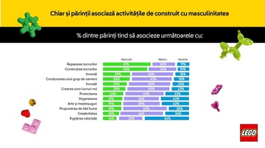 Studiul, realizat pe un eşantion de 32.605 părinţi şi copii din 21 de ţări, dintre care 1.565 din România a arătat că 55% dintre adulţii intervievaţi cred că societatea încă îi consideră pe băieţi ca fiind în mod natural mai buni constructori decât fetele. Nu este surprinzător faptul că, în consecinţă, fetele şi mamele îşi subestimează adesea propriile abilităţi de construcţie în comparaţie cu băieţii şi taţii. O perspectivă pe care Grupul Lego şi-a propus să o schimbe.