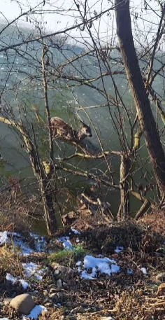 O femeie care trecea prin zonă l-a observat în timp ce se chinuia să urce pe malul abrupt şi având o barieră de arbori, astel că a sunat la 112 şi un echipaj de pompieri militari a pornit în misiunea inedită.