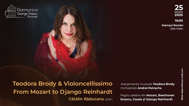 “From Mozart to Django Reinhardt”, recitalul cameral susţinut de Teodora Brody, ansamblul Violoncellissimo şi invitaţii lor, propune în 25 noiembrie, la Ateneul Român, un parcurs muzical îndrăzneţ, de la clasic la jazz manouche, în aranjamente muzicale semnate de Brody şi orchestraţiile tânărului compozitor Andrei Petrache.