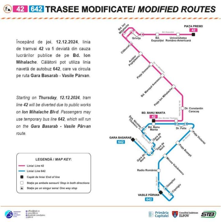 Potrivit unui comunicat al TPBI, de joi, linia de tramvai 42 va funcţiona pe un traseu modificat, între “Piaţa Presei” şi “Bd. Banu Manta”, iar în zonele unde nu vor mai circula tramvaiele, călătorii vor fi preluaţi de linia navetă de autobuz 642 (care va funcţiona între “Gara Basarab” şi “Vasile Pârvan”). TPBI a dispus aceste măsuri ca urmare a desfăşurării lucrărilor la reţeaua de termoficare de pe Bulevardul Ion Mihalache.