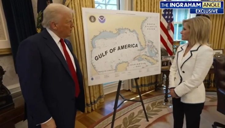 Donald Trump a amplasat, de asemenea, în mod vizibil o hartă mare a “Golfului Americii”, aşa cum cel de-al 45-lea şi al 47-lea preşedinte al Statelor Unite a decis să redenumească Golful Mexic.