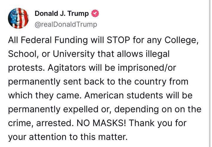 Într-o postare pe platforma sa media, Truth Social, Trump a scris: „Toate finanţările federale vor înceta pentru orice colegiu, şcoală sau universitate care permite proteste ilegale. Agitatorii vor fi închişi şi/sau trimişi definitiv înapoi în ţara din care au venit. Studenţii americani vor fi exmatriculaţi permanent sau, în funcţie de infracţiune, arestaţi. FĂRĂ MĂŞTI! Vă mulţumim pentru atenţia acordată acestei probleme”.