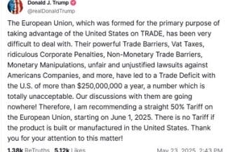 Preşedintele republican a declarat că doreşte să impună taxe de import mai mari asupra mărfurilor provenite din UE, un aliat de lungă durată al SUA, decât asupra celor provenite din China, un rival geopolitic căruia i-au fost reduse tarifele la 30% în această lună, pentru ca Washingtonul şi Beijingul să poată purta negocieri. Trump s-a declarat nemulţumit de lipsa de progrese în negocierile comerciale cu UE. Bruxelles-ul a propus să reducă tarifele la zero, chiar dacă preşedintele a insistat public să menţină o taxă de bază de 10% asupra majorităţii importurilor. „Discuţiile noastre cu ei nu duc nicăieri!”, a scris Trump pe Truth Social. „Prin urmare, recomand aplicarea unei taxe vamale de 50% asupra Uniunii Europene, începând cu 1 iunie 2025. Nu se aplică nicio taxă vamală dacă produsul este fabricat sau produs în Statele Unite”, a precizat el.
