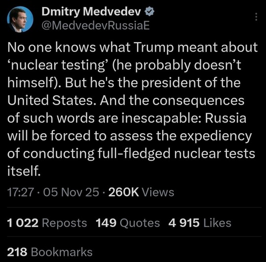 ”El este preşedintele Statelor Unite. Iar consecinţele unor astfel de declaraţii sunt inevitabile: Rusia va fi obligată să evalueze oportunitatea de a proceda ea însăşi la teste nucleare la scară mare”, îl persiflează Medvedev pe Trump.