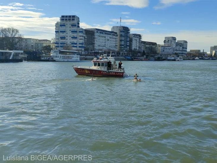 Episcopul Tulcei, Prea Sfinţia Sa Visarion, a oficiat, luni, pe faleza Ivan Patzaichin din Tulcea, slujba Sfinţirii Mari a apei şi a aruncat o cruce din busuioc în Dunăre, aceasta fiind adusă la mal de doi tineri înotători care se pregătesc pentru Campionatul mondial de înot în ape îngheţate, ce va avea loc săptămâna viitoare în Molveno, Italia.