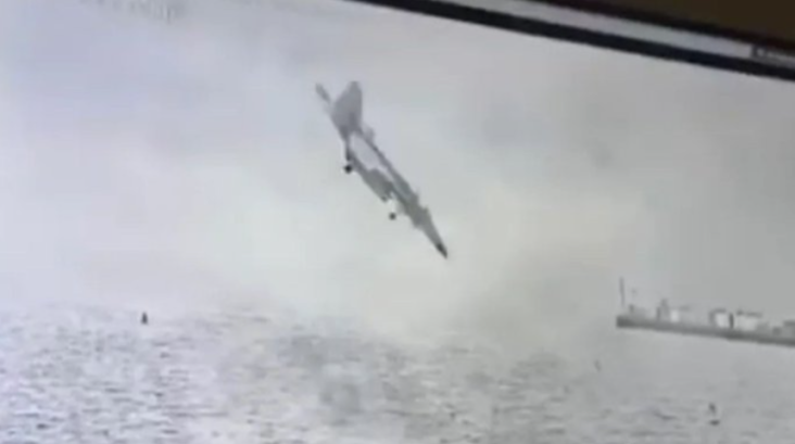 Imaginile surprind un avion de vânătoare care ”cade în nas” vertiginos spre apă.