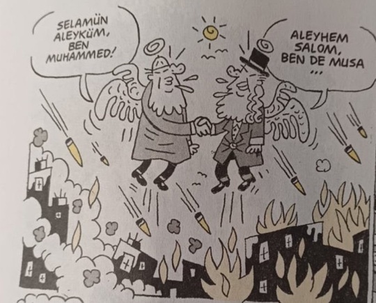 În caricatura incriminată, publicată la 25 iunie în revista satirică Leman, apar două personaje care se întâlnesc în cer, deasupra unui oraş zdrobit de bombe, unul pe nume Mohammed, celălalt Musa (Moise).