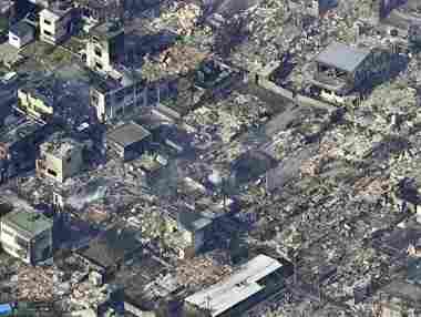 Imaginile aeriene difuzate de posturile de televiziune au arătat case transformate în ruine şi coloane groase de fum ridicându-se din cartierul Saganoseki al oraşului Oita, situat pe un deal, care domină acest port pescăresc renumit pentru macroul de calitate superioară Seki.