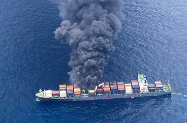 Fotografii făcute din avion de către Paza de Coastă surprind o coloană de fum dens şi negru şi containere care par că au fost aruncate de explozie puternică la bord.