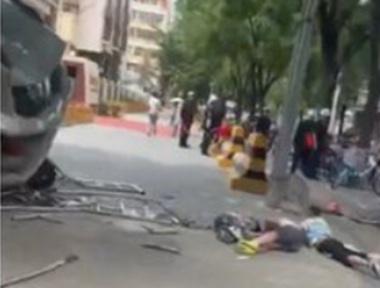 Several children were reportedly injured and seen lying on a road near a primary school in Beijing after a car hit them and then crashed into a fence.