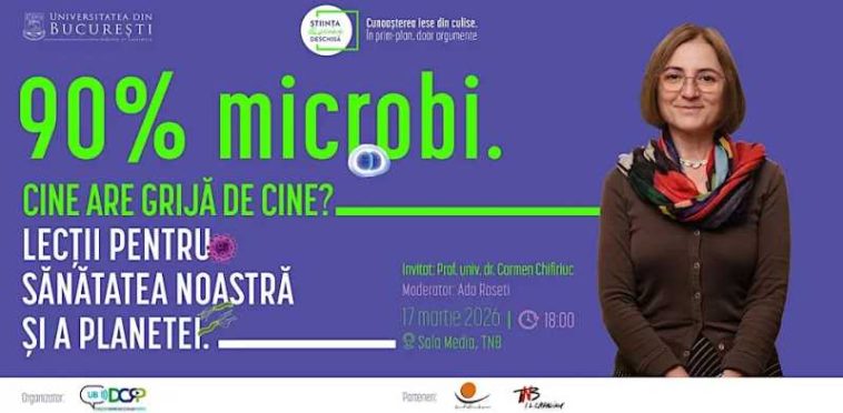 Potrivit unui comunicat de presă remis AGERPRES, evenimentul o va avea invitată pe Carmen Chifiriuc, cercetătoare și cadru didactic la UB, care va susține conferința ‘90% microbi. Cine are grijă de cine? Lecții pentru sănătatea noastră și a Planetei’.