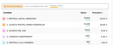 UPDATE: După centralizarea a 57,78% dintre procesele verbale, candidatul PSD pentru preşedinţia Consiliului Judeţean Buzău este în continuare în frunte, cu 53,04% dintre voturi.
