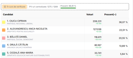 În acest moment, diferenţa dintre candidatul PNL, Cuprian Ciucu şi Anca Alexandrescu, clasată pe locul al doilea, a depăşit patru procente. În voturi, Ciucu are deja cu 81.000 mai multe deât Anca Alexandrescu.