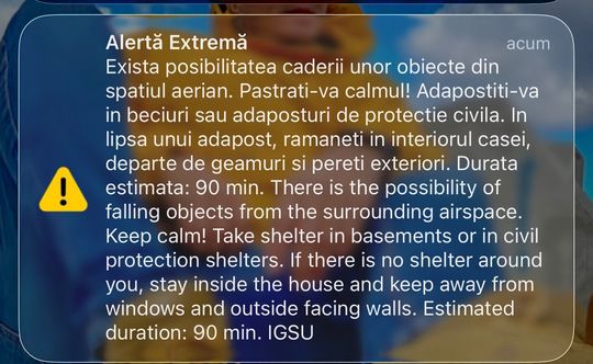 ”De asemenea, îndemnăm populaţia să fie precaută, iar dacă observă obiecte ce cad din spaţiul aerian ori altceva ce le poate pune în pericol siguranţa şi integritatea, ori dacă au nevoie de ajutor şi informaţii să apeleze cu încredere numărul unic de urgenţă 112. Mesajele RO-Alert sunt transmise populaţiei pentru a informa în primul rând, şi pentru a ridica nivelul de siguranţă al cetăţenilor”, a arătat sursa citată.