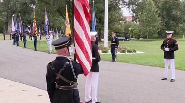 Soldaţi în uniformă, purtând steagurile fiecărui stat american, stau în poziţie de drepţi, aşteptând sosirea celor şapte lideri care vor participa la discuţii.