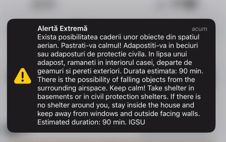 ŞTIREA INIŢIALĂ – ”În urmă cu scurt timp, Inspectoratul General pentru Situaţii de Urgenţă a emis un mesaj de tip RO-Alert pentru zona de Nord a judeţului Tulcea prin care informează locuitori despre posibilitatea căderii unor obiecte din spaţiul aerian. Acest mesaj este trimis după ce structurile cu rol de apărare a frontierelor au detectat posibile ţinte în apropiere de graniţele României”, a transmis, miercuri seară, ISU Tulcea.
