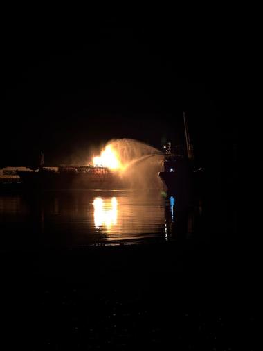 UPDATE – Autorităţile din Ucraina intervin cu tunuri de apă pentru a stinge incendiul produs la nava încărcată cu GPL care se află în zona Ismail. În imagini se observă că flacăra a mai scăzut în intensitate, iar echipajele de intervenţie acţionează pentru a răci zona de ardere.