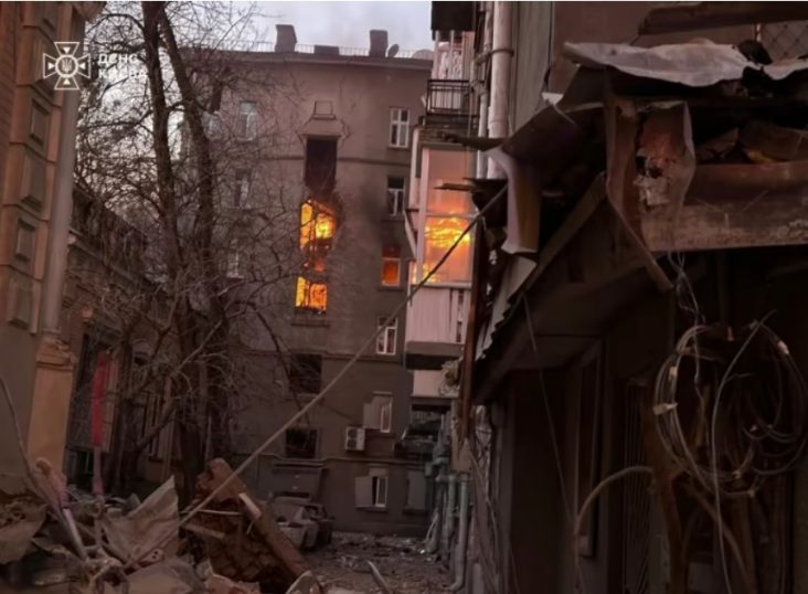 Fotografii postate de Serviciul de Stat pentru Situaţii de Urgenţă au arătat pompieri stingând un incendiul la o parte distrusă a unei clădiri şi salvatori ajutând victime în vârstă.