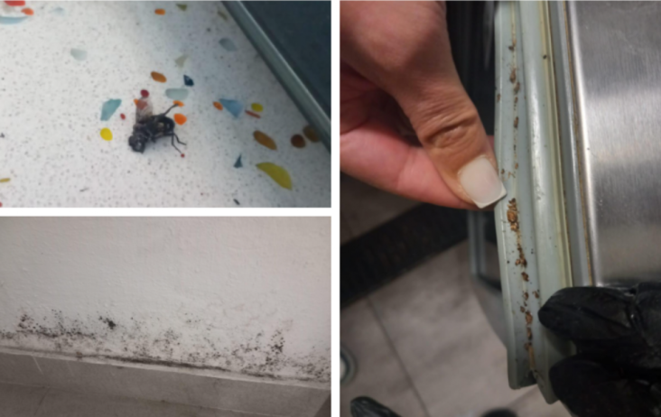 – echipamente de gătit neigienizate necorespunzător, prezentau depuneri de grăsime arsă, prezența ruginei, în spatele echipamentelor se regăsea un strat grosier de resturi alimentare, grăsime arsă, impurități