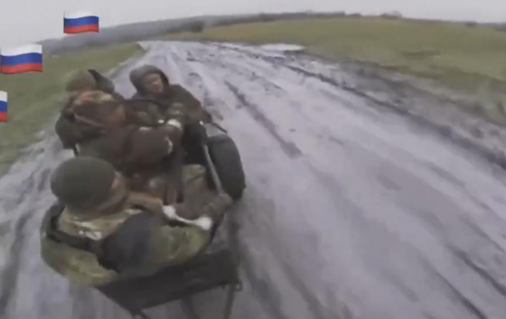 Imagini virale pe frontul din Ucraina! Mai mulți soldați ruși sunt cărați într-o remorcă improvizată trasă de un ATV.