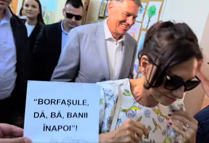 „Din partea mea, domnule Iohannis: ‘Borfașilor, dați banii înapoi, bă!’“, scria pe cartonașul pe care i l-a împins fostului șef de stat. „Credeți că meritați acest statut de fost șef de stat? Borfașule, dă banii înapoi! 260.000 de euro!“, a mai comentat Ceaușescu