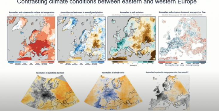 Acest document de o sută de pagini face bilanțul „contrastelor climatice izbitoare” dintre est și vest, care sunt destul de neobișnuite. Din cauza precipitațiilor intense și prelungite din 2024, Europa de Vest a cunoscut unul dintre cei mai ploioși zece ani înregistrați din 1950. Franța, Belgia, Olanda, Luxemburgul și Danemarca s-au numărat printre cele mai ploioase țări. Spania și Italia au înregistrat chiar și cel mai ploios an din 1979 încoace.