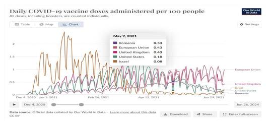 ”În mai 2021, când Florin Cîţu a decis în şedinţă de Guvern să facă acea comandă de vaccinuri, campania de vaccinare mergea prost şi românii deja nu se mai vaccinau. E pur şi simplu fals. Românii se vaccinau mai mult decât media europeană, SUA, UK sau chiar Israel”, afirmă Vlad Voiculescu, distribind şi un grafic.