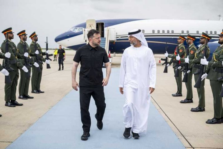 Zelenski a anunțat pe rețelele sociale că s-a întâlnit cu președintele EAU, Mohammed bin Zayed Al Nahyan, și că cei doi lideri ‘au convenit să coopereze în domeniul securității și apărării. Echipele noastre vor finaliza detaliile’.