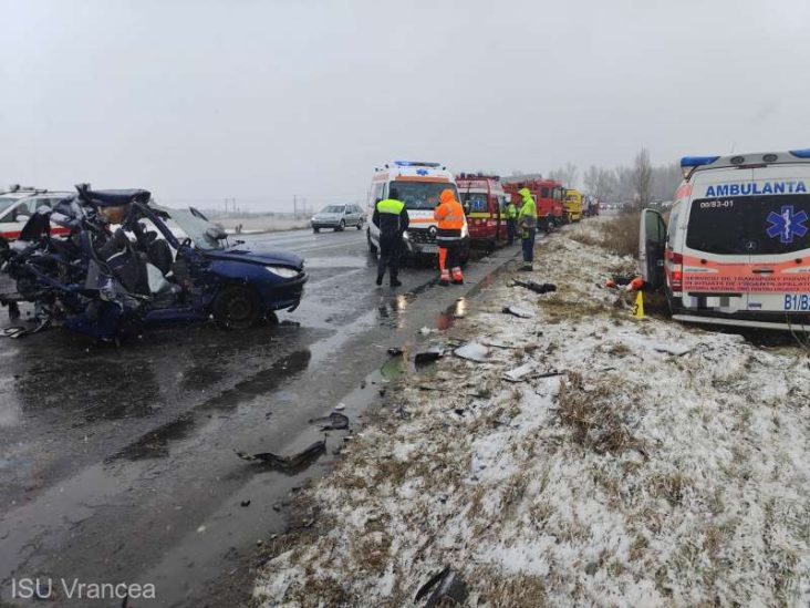 “Astăzi, ora 10,07, Dispeceratul IPJ Vrancea a fost sesizat prin apel 112 cu privire la producerea unui eveniment rutier în afara municipiului Adjud, pe DN2 – E85. Din primele cercetări efectuate la faţa locului rezultă că accidentul, în care au fost implicate două autovehicule, dintre care o ambulanţă privată ce aparţine unui spital din Bucureşti, s-a produs pe fondul neadaptării vitezei la condiţiile de drum, derapare şi pătrunderea pe contrasens. Din nefericire, a rezultat decesul pasagerului dreapta faţă din autoturism, rănirea gravă a pasagerului stânga spate din autoturism şi rănirea uşoară a altor trei persoane, dintre care două cadre medicale din ambulanţa privată şi una din autoturism – conducătorul auto al acestuia”, a precizat purtătorul de cuvânt al IPJ Vrancea, Cătălina Murariu.